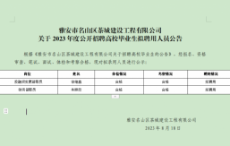 雅安市名山區(qū)茶城建設(shè)工程有限公司系雅安市名山區(qū)區(qū)屬一級國有企業(yè),成立于2018年,注冊資本2億元,主要經(jīng)營范圍為對土地、城市資源等領(lǐng)域及保障性住房、房地產(chǎn)開發(fā)、城市基礎(chǔ)設(shè)施、公共服務(wù)設(shè)施等進(jìn)行經(jīng)營管理;并開展項(xiàng)目投資、工程管理服務(wù)及園林綠化、環(huán)境治理、土地整理等各類工程建設(shè)活動。根據(jù)公司2022年人員招聘計(jì)劃,茶城公司及全資子公司擬面向社會公開招聘高校畢業(yè)生3名(含2020年、2021年未就業(yè)高校畢業(yè)生和2022年應(yīng)屆高校畢業(yè)生。特別說明:“未就業(yè)高校畢業(yè)生”需同時滿足以下條件:拿到畢業(yè)證和學(xué)位證;在規(guī)定擇業(yè)期內(nèi)沒有與任何單位簽訂任何形式的勞動合同...
